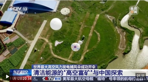 总台央视记者:内蒙古阿拉善左旗,全球最大高空捕风伞实验测试现场。随着氦气球缓缓升空,牵引着展开面积达5000平方米的捕风伞在空中打开,标志着我国自主研发的大型伞梯式陆基高空风力发电项目试验取得重要进展。