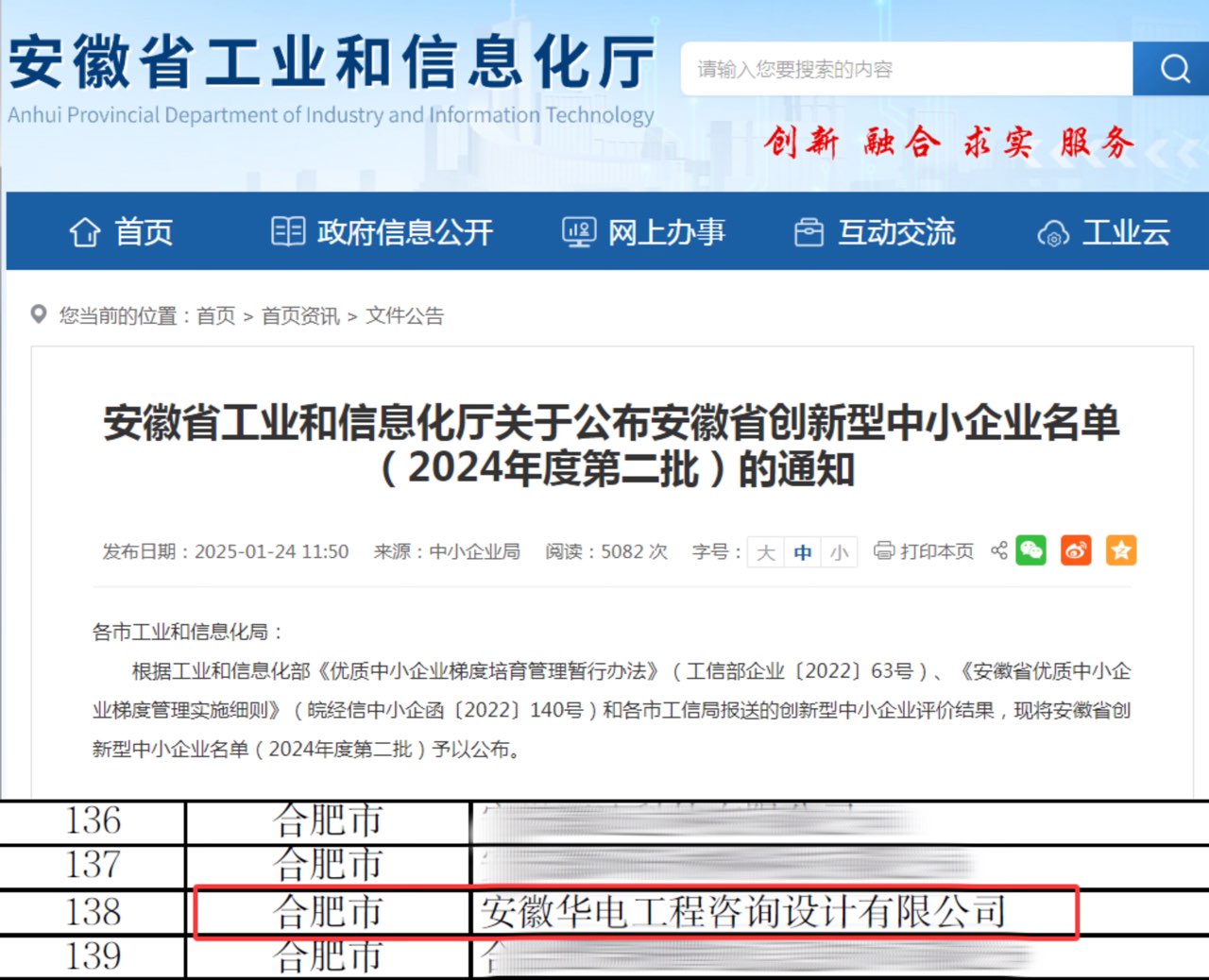 近日获悉,安徽省工业和信息化厅发布了安徽省创新型中小企业名单(2024年度第二批),华电公司凭借在电力系统规划、工程咨询、工程勘察、工程设计和工程总承包等方面的技术创新能力和成果,顺利通过省工信厅的评估,成为安徽省创新型中小企业。